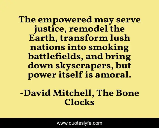 This page presents the quote "The empowered may serve justice, remodel the Earth, transform lush nations into smoking battlefields, and bring down skyscrapers, but power itself is amoral.". Author of this quote is David Mitchell, The Bone Clocks. .