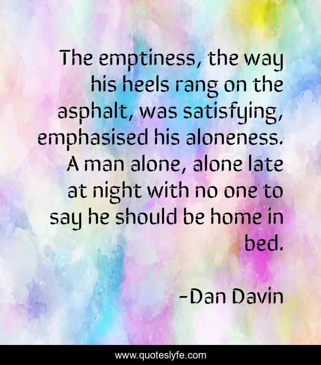 This page presents the quote "The emptiness, the way his heels rang on the asphalt, was satisfying, emphasised his aloneness. A man alone, alone late at night with no one to say he should be home in bed.". Author of this quote is Dan Davin. This quote is about night, selected-stories, freedom, dan-davin, street, that-golden-time, alone,.