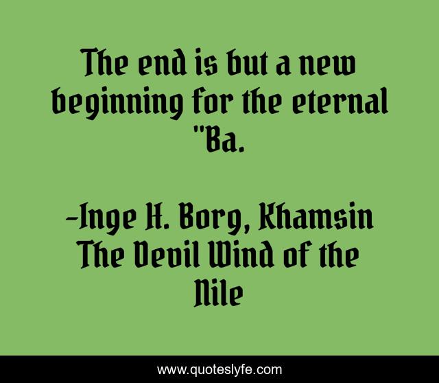 This page presents the quote "The end is but a new beginning for the eternal "Ba.". Author of this quote is Inge H. Borg, Khamsin The Devil Wind of the Nile. This quote is about saga, historical-fiction, ancient-egypt,.