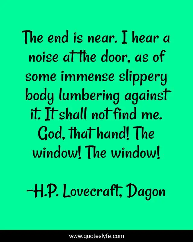 This page presents the quote "The end is near. I hear a noise at the door, as of some immense slippery body lumbering against it. It shall not find me. God, that hand! The window! The window!". Author of this quote is H.P. Lovecraft, Dagon. This quote is about horror, cthulhu, lovecraft,.