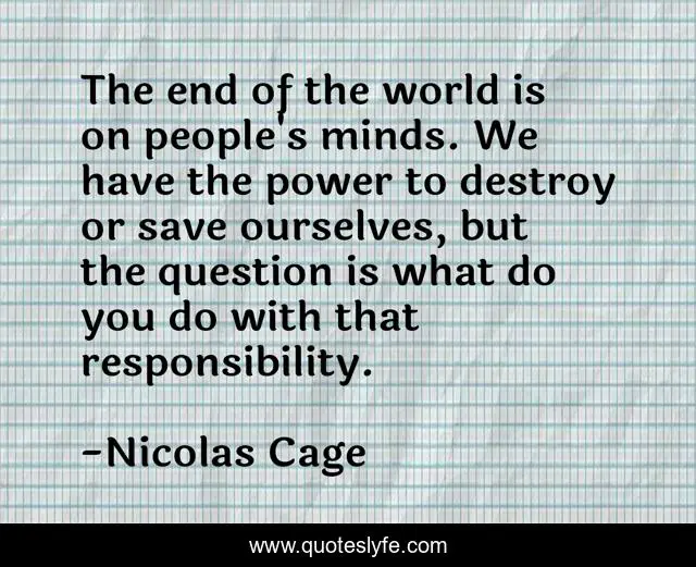 This page presents the quote "The end of the world is on people's minds. We have the power to destroy or save ourselves, but the question is what do you do with that responsibility.". Author of this quote is Nicolas Cage. This quote is about world, end, responsibility,.