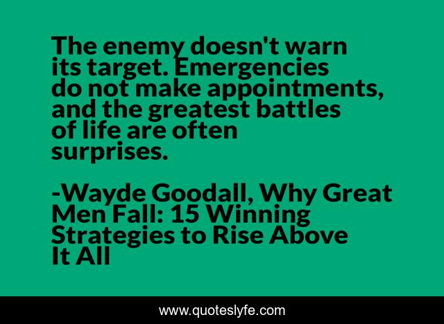 This page presents the quote "The enemy doesn't warn its target. Emergencies do not make appointments, and the greatest battles of life are often surprises.". Author of this quote is Wayde Goodall, Why Great Men Fall: 15 Winning Strategies to Rise Above It All. This quote is about failure, leadership, inpsiration, success,.