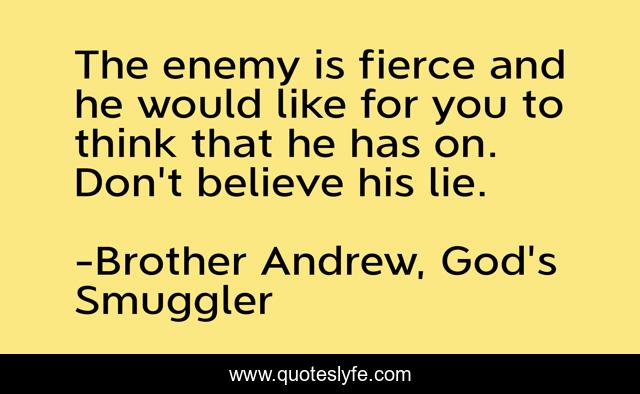 This page presents the quote "The enemy is fierce and he would like for you to think that he has on. Don't believe his lie.". Author of this quote is Brother Andrew, God's Smuggler. This quote is about lies, satan, christianity,.