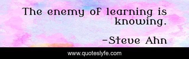 This page presents the quote "The enemy of learning is knowing.". Author of this quote is Steve Ahn. This quote is about students, teaching, school, education,.