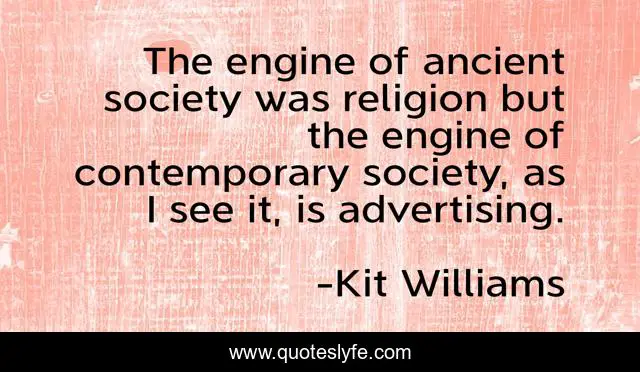 This page presents the quote "The engine of ancient society was religion but the engine of contemporary society, as I see it, is advertising.". Author of this quote is Kit Williams. This quote is about society, see, advertising,.