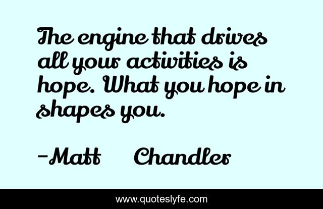 This page presents the quote "The engine that drives all your activities is hope. What you hope in shapes you.". Author of this quote is Matt Chandler. This quote is about faith, motivation, leadership, idolatry, discipleship, vision,.