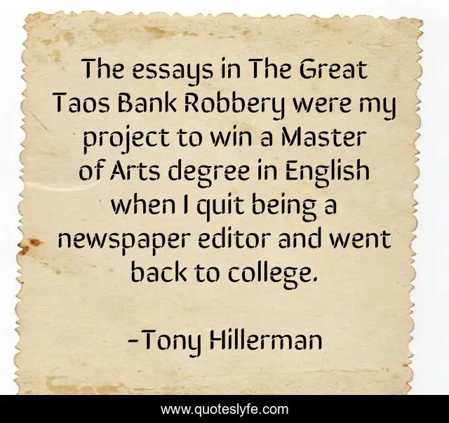 This page presents the quote "The essays in The Great Taos Bank Robbery were my project to win a Master of Arts degree in English when I quit being a newspaper editor and went back to college.". Author of this quote is Tony Hillerman. This quote is about win, great, college,.