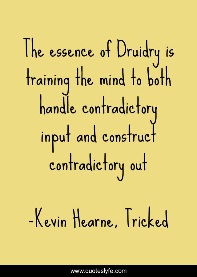 This page presents the quote "The essence of Druidry is training the mind to both handle contradictory input and construct contradictory out". Author of this quote is Kevin Hearne, Tricked. This quote is about contradictory-input, politicians,.