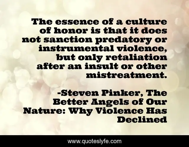 This page presents the quote "The essence of a culture of honor is that it does not sanction predatory or instrumental violence, but only retaliation after an insult or other mistreatment.". Author of this quote is Steven Pinker, The Better Angels of Our Nature: Why Violence Has Declined. This quote is about revenge, violence, retaliation, insult, culture, honor,.