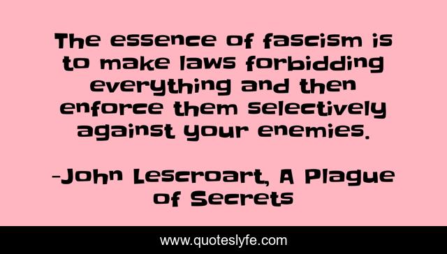 This page presents the quote "The essence of fascism is to make laws forbidding everything and then enforce them selectively against your enemies.". Author of this quote is John Lescroart, A Plague of Secrets. This quote is about fascism, enemies, laws,.