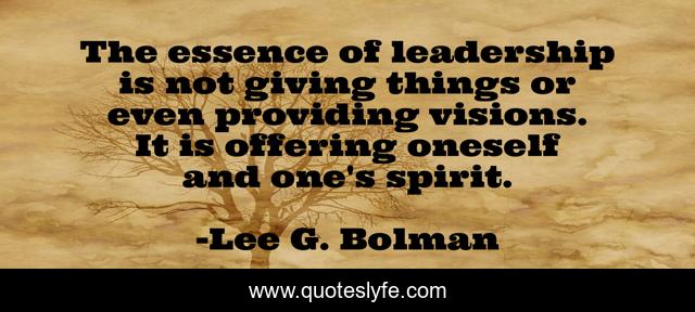 This page presents the quote "The essence of leadership is not giving things or even providing visions. It is offering oneself and one's spirit.". Author of this quote is Lee G. Bolman. .