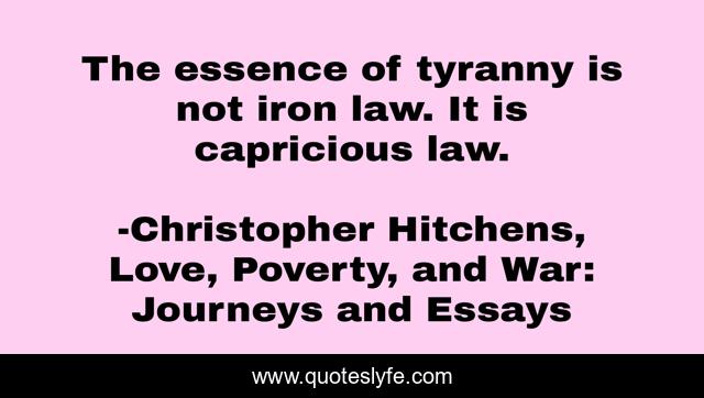 This page presents the quote "The essence of tyranny is not iron law. It is capricious law.". Author of this quote is Christopher Hitchens, Love, Poverty, and War: Journeys and Essays. This quote is about caprice, tyranny, law,.