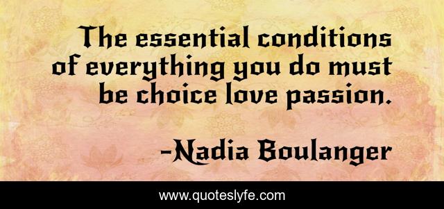 This page presents the quote "The essential conditions of everything you do must be choice love passion.". Author of this quote is Nadia Boulanger. .