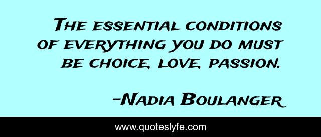 This page presents the quote "The essential conditions of everything you do must be choice, love, passion.". Author of this quote is Nadia Boulanger. This quote is about passion, choice,.