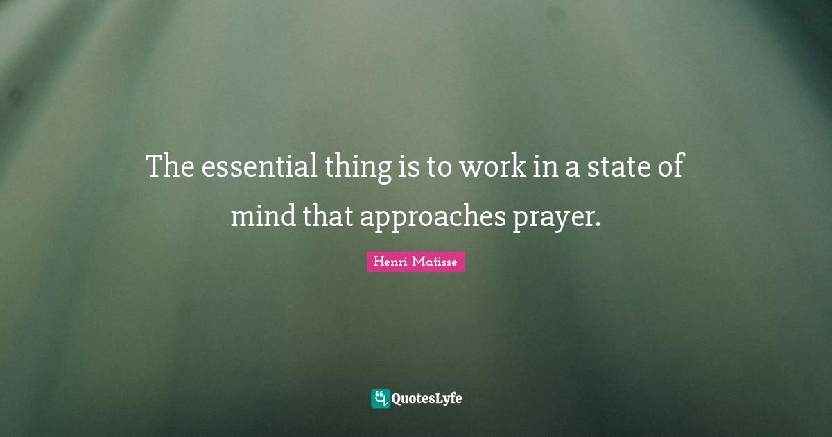 This page presents the quote "The essential thing is to work in a state of mind that approaches prayer.". Author of this quote is Henri Matisse. This quote is about state of mind, mind, essentials, work, prayer,.
