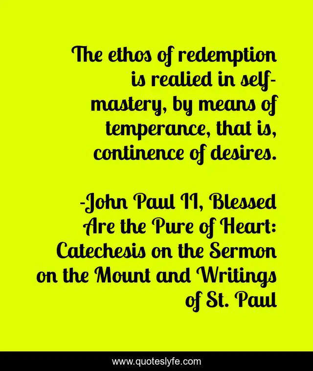 This page presents the quote "The ethos of redemption is realied in self-mastery, by means of temperance, that is, continence of desires.". Author of this quote is John Paul II, Blessed Are the Pure of Heart: Catechesis on the Sermon on the Mount and Writings of St. Paul. This quote is about philosophy, p194, truth, wisdom,.