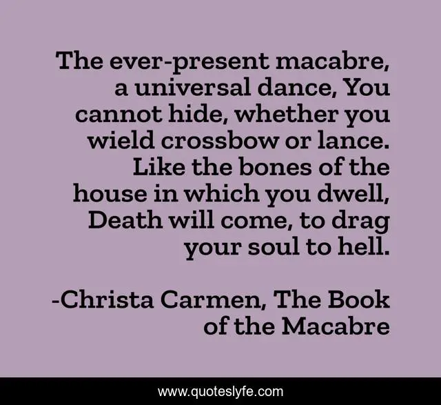 This page presents the quote "The ever-present macabre, a universal dance, You cannot hide, whether you wield crossbow or lance. Like the bones of the house in which you dwell, Death will come, to drag your soul to hell.". Author of this quote is Christa Carmen, The Book of the Macabre. .
