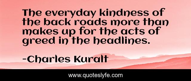 This page presents the quote "The everyday kindness of the back roads more than makes up for the acts of greed in the headlines.". Author of this quote is Charles Kuralt. This quote is about roads, kindness, greed,.