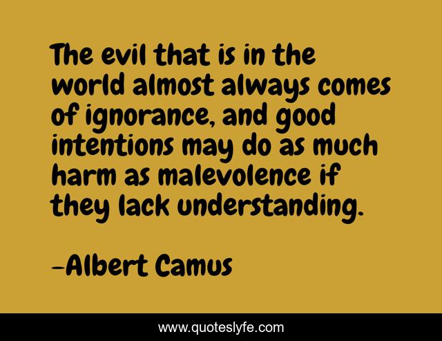 This page presents the quote "The evil that is in the world almost always comes of ignorance, and good intentions may do as much harm as malevolence if they lack understanding.". Author of this quote is Albert Camus. This quote is about world, ignorance, evil,.