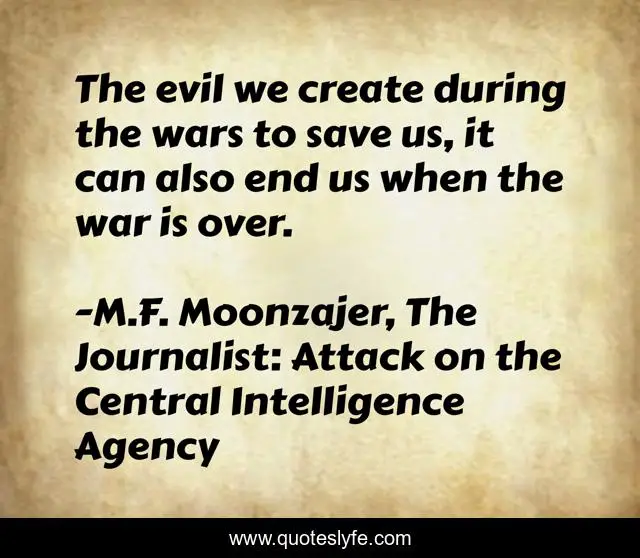 This page presents the quote "The evil we create during the wars to save us, it can also end us when the war is over.". Author of this quote is M.F. Moonzajer, The Journalist: Attack on the Central Intelligence Agency. This quote is about end, create, battles, evil, save, war,.