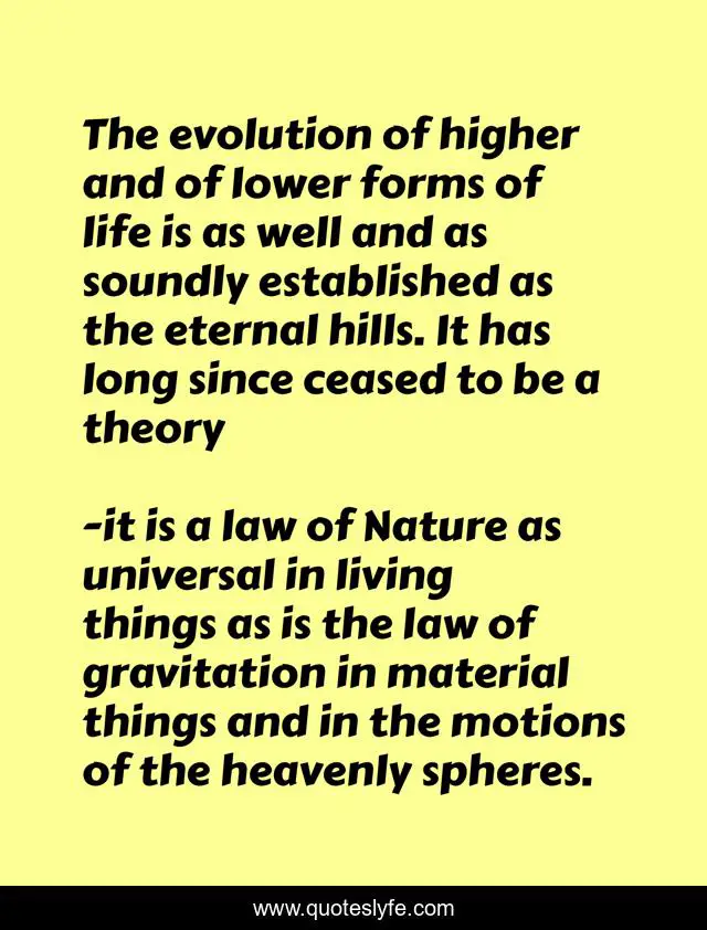 This page presents the quote "The evolution of higher and of lower forms of life is as well and as soundly established as the eternal hills. It has long since ceased to be a theory". Author of this quote is it is a law of Nature as universal in living things as is the law of gravitation in material things and in the motions of the heavenly spheres.. .