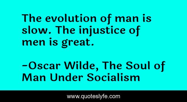 This page presents the quote "The evolution of man is slow. The injustice of men is great.". Author of this quote is Oscar Wilde, The Soul of Man Under Socialism. This quote is about evolution, nature, the-folly-of-man, injustice,.