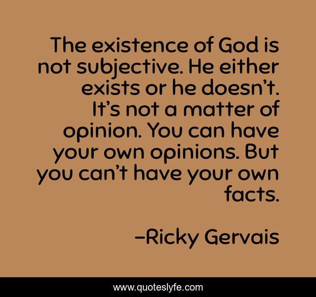 This page presents the quote "The existence of God is not subjective. He either exists or he doesn’t. It’s not a matter of opinion. You can have your own opinions. But you can’t have your own facts.". Author of this quote is Ricky Gervais. This quote is about atheism, religion, science,.