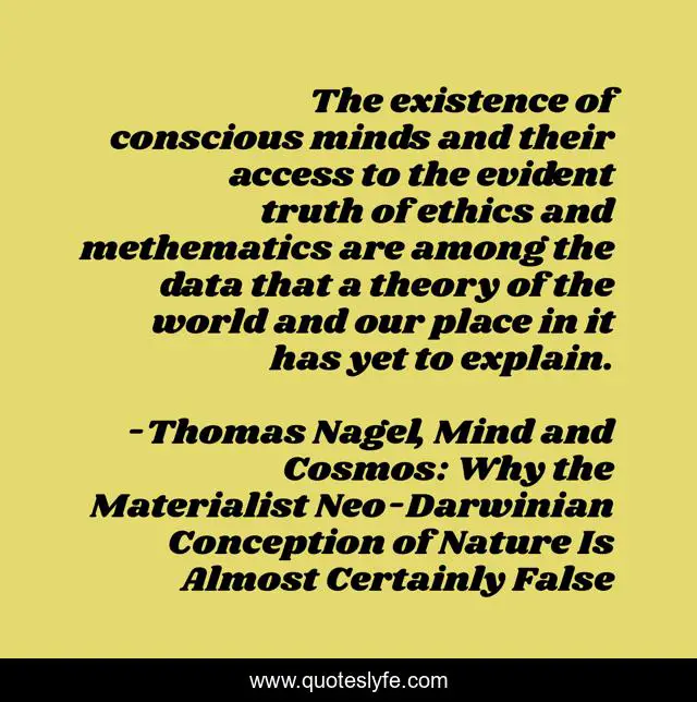 This page presents the quote "The existence of conscious minds and their access to the evident truth of ethics and methematics are among the data that a theory of the world and our place in it has yet to explain.". Author of this quote is Thomas Nagel, Mind and Cosmos: Why the Materialist Neo-Darwinian Conception of Nature Is Almost Certainly False. This quote is about existence, consciousness, mind, theory, truth,.