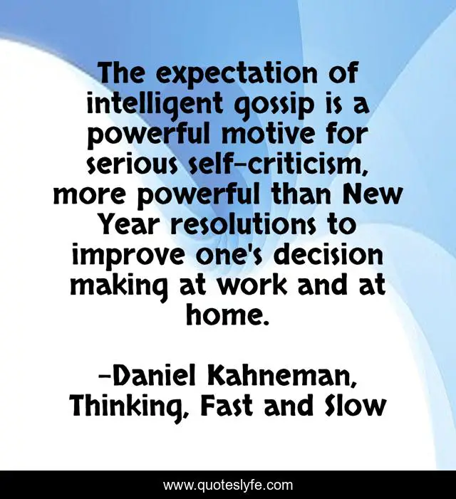 This page presents the quote "The expectation of intelligent gossip is a powerful motive for serious self-criticism, more powerful than New Year resolutions to improve one's decision making at work and at home.". Author of this quote is Daniel Kahneman, Thinking, Fast and Slow. This quote is about resolution, decision-making, expectation, self-criticism, motive, gossip, intelligent,.