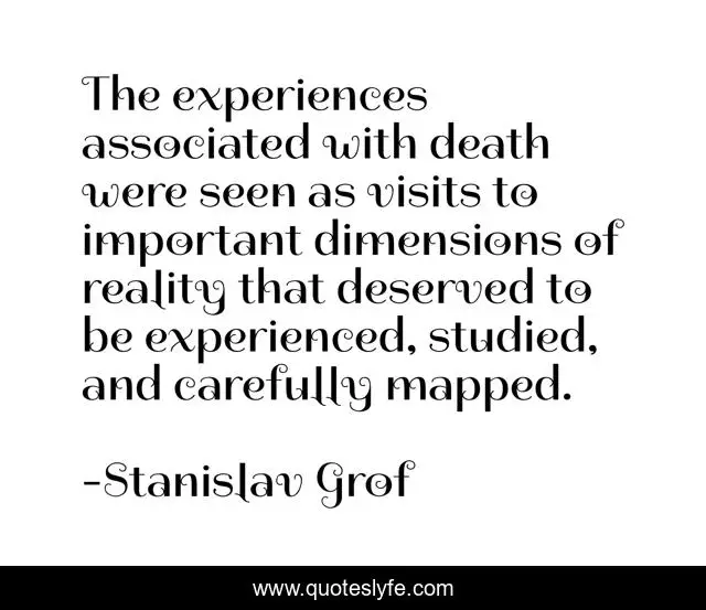 This page presents the quote "The experiences associated with death were seen as visits to important dimensions of reality that deserved to be experienced, studied, and carefully mapped.". Author of this quote is Stanislav Grof. This quote is about important, reality,.