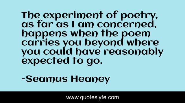 This page presents the quote "The experiment of poetry, as far as I am concerned, happens when the poem carries you beyond where you could have reasonably expected to go.". Author of this quote is Seamus Heaney. .