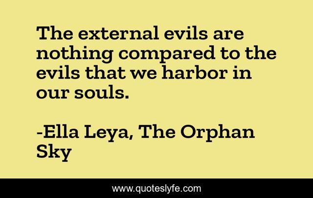 This page presents the quote "The external evils are nothing compared to the evils that we harbor in our souls.". Author of this quote is Ella Leya, The Orphan Sky. This quote is about soul, evil,.