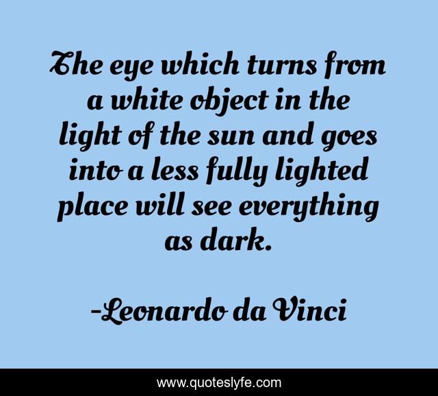 This page presents the quote "The eye which turns from a white object in the light of the sun and goes into a less fully lighted place will see everything as dark.". Author of this quote is Leonardo da Vinci. This quote is about seeing, perception, eye, darkness, sun, light,.