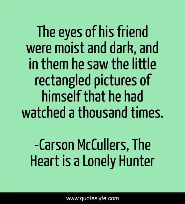 This page presents the quote "The eyes of his friend were moist and dark, and in them he saw the little rectangled pictures of himself that he had watched a thousand times.". Author of this quote is Carson McCullers, The Heart is a Lonely Hunter. .