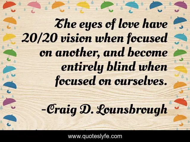 This page presents the quote "The eyes of love have 20/20 vision when focused on another, and become entirely blind when focused on ourselves.". Author of this quote is Craig D. Lounsbrough. This quote is about blind, love, focus, another, selfishness, blinded, caring, selfish, giving,.