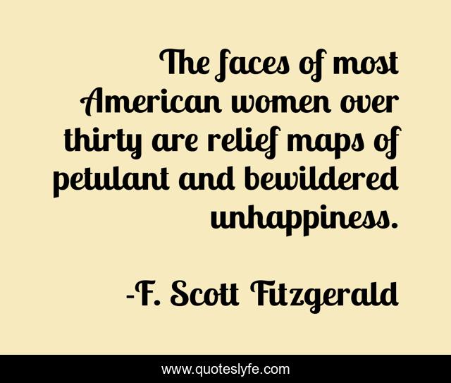This page presents the quote "The faces of most American women over thirty are relief maps of petulant and bewildered unhappiness.". Author of this quote is F. Scott Fitzgerald. This quote is about maps, american, thirty,.