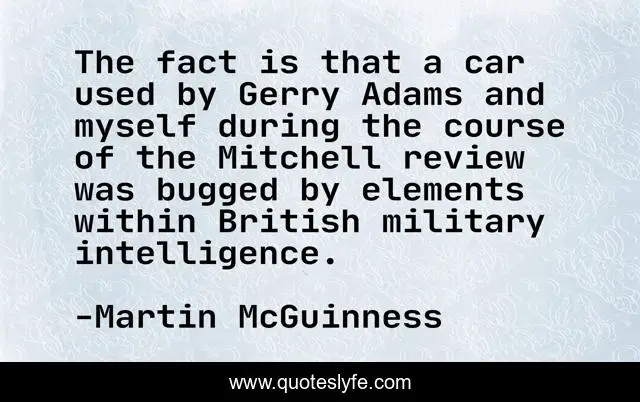 This page presents the quote "The fact is that a car used by Gerry Adams and myself during the course of the Mitchell review was bugged by elements within British military intelligence.". Author of this quote is Martin McGuinness. This quote is about car, myself, military,.