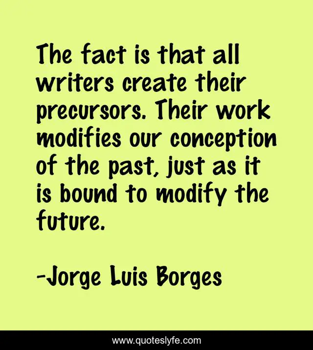 This page presents the quote "The fact is that all writers create their precursors. Their work modifies our conception of the past, just as it is bound to modify the future.". Author of this quote is Jorge Luis Borges. This quote is about past, create, work,.