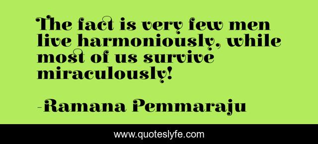 This page presents the quote "The fact is very few men live harmoniously, while most of us survive miraculously!". Author of this quote is Ramana Pemmaraju. This quote is about life, peace, miracles-in-your-life, survival-of-the-fittest, harmony, living-harmoniously, life-philosophy, meditation, life-and-living,.