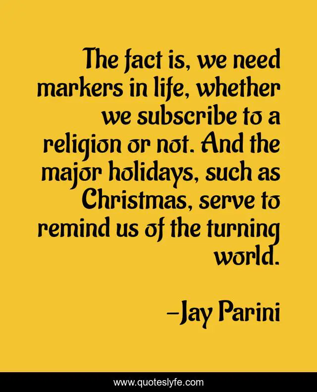 This page presents the quote "The fact is, we need markers in life, whether we subscribe to a religion or not. And the major holidays, such as Christmas, serve to remind us of the turning world.". Author of this quote is Jay Parini. This quote is about religion, life, world,.