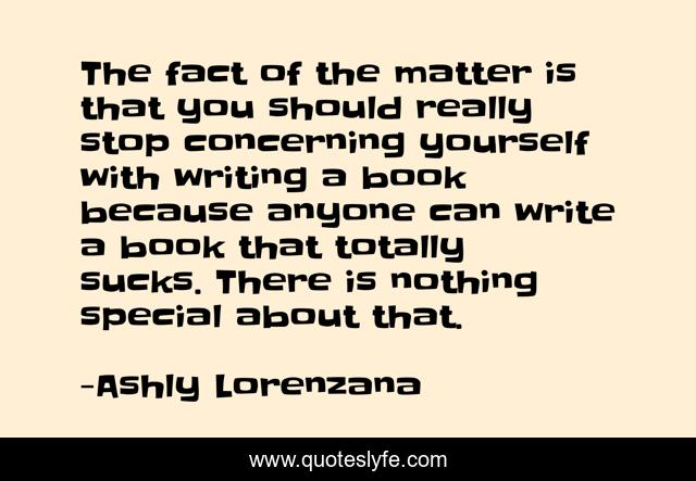 This page presents the quote "The fact of the matter is that you should really stop concerning yourself with writing a book because anyone can write a book that totally sucks. There is nothing special about that.". Author of this quote is Ashly Lorenzana. This quote is about authors, advice, books, storytelling, writing,.