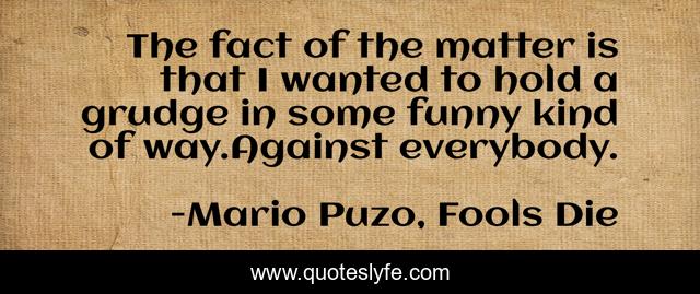 This page presents the quote "The fact of the matter is that I wanted to hold a grudge in some funny kind of way.Against everybody.". Author of this quote is Mario Puzo, Fools Die. This quote is about anger, grudge,.