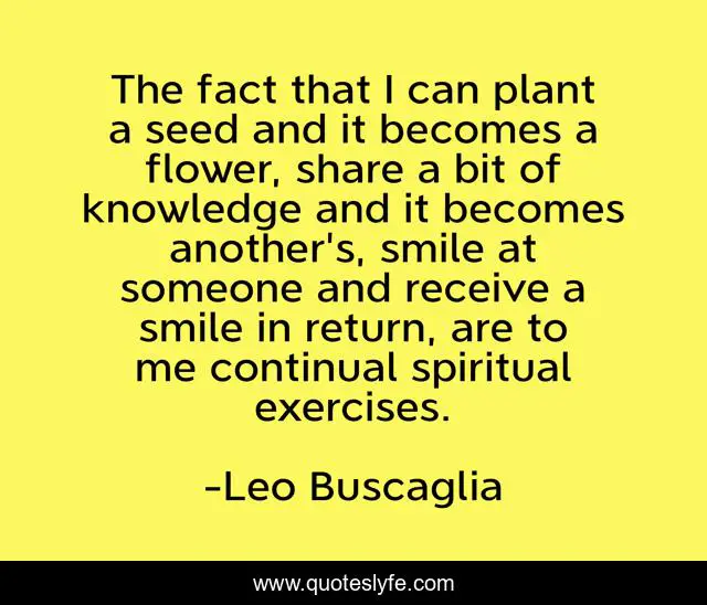 This page presents the quote "The fact that I can plant a seed and it becomes a flower, share a bit of knowledge and it becomes another's, smile at someone and receive a smile in return, are to me continual spiritual exercises.". Author of this quote is Leo Buscaglia. This quote is about smile, flower, knowledge, happiness,.