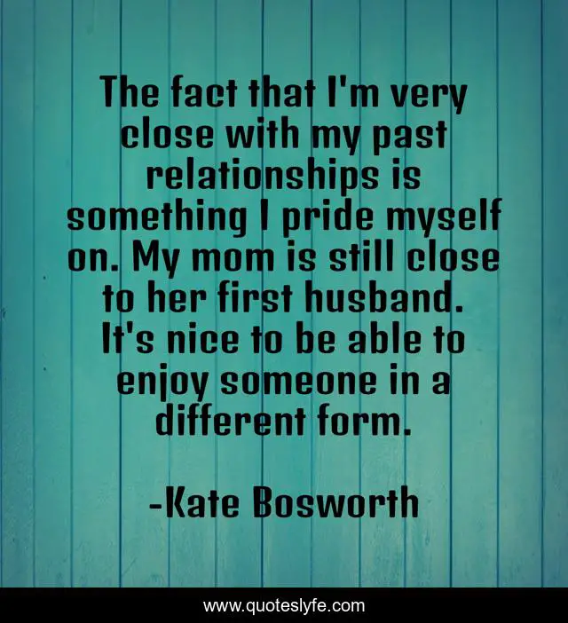 This page presents the quote "The fact that I'm very close with my past relationships is something I pride myself on. My mom is still close to her first husband. It's nice to be able to enjoy someone in a different form.". Author of this quote is Kate Bosworth. This quote is about past, myself, pride,.