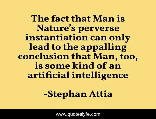 This page presents the quote "The fact that Man is Nature’s perverse instantiation can only lead to the appalling conclusion that Man, too, is some kind of an artificial intelligence". Author of this quote is Stephan Attia. This quote is about rousseau, darwin, inequality, civilization, robots,.