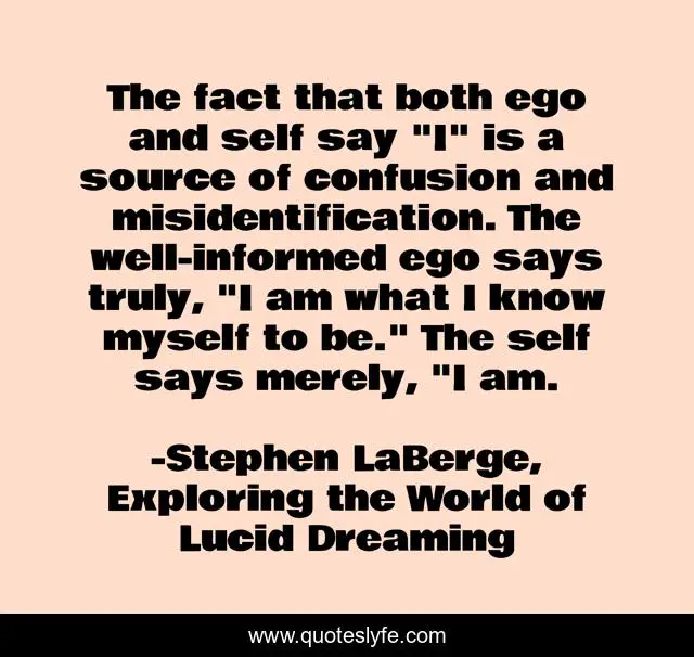 This page presents the quote "The fact that both ego and self say "I" is a source of confusion and misidentification. The well-informed ego says truly, "I am what I know myself to be." The self says merely, "I am.". Author of this quote is Stephen LaBerge, Exploring the World of Lucid Dreaming. This quote is about ego, identity,.