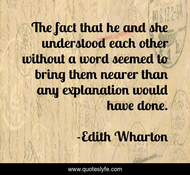 This page presents the quote "The fact that he and she understood each other without a word seemed to bring them nearer than any explanation would have done.". Author of this quote is Edith Wharton. This quote is about love, truth, affection, understanding,.