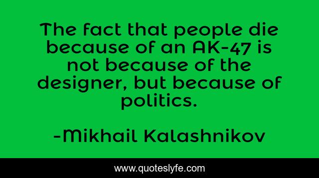 This page presents the quote "The fact that people die because of an AK-47 is not because of the designer, but because of politics.". Author of this quote is Mikhail Kalashnikov. This quote is about die, fact, people,.