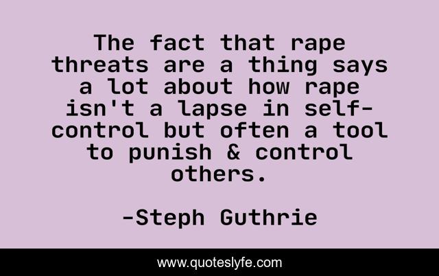 This page presents the quote "The fact that rape threats are a thing says a lot about how rape isn't a lapse in self-control but often a tool to punish & control others.". Author of this quote is Steph Guthrie. This quote is about rape-culture, rape-as-a-weapon, rape-jokes, say-no-to-rape-jokes, self-control, rape,.