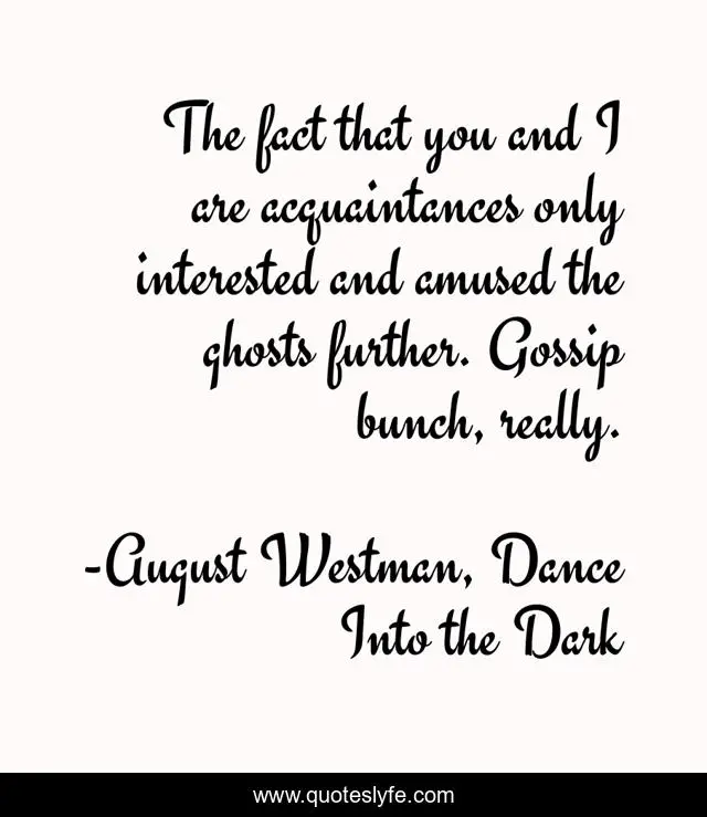 This page presents the quote "The fact that you and I are acquaintances only interested and amused the ghosts further. Gossip bunch, really.". Author of this quote is August Westman, Dance Into the Dark. This quote is about funny, ghosts, comedy,.
